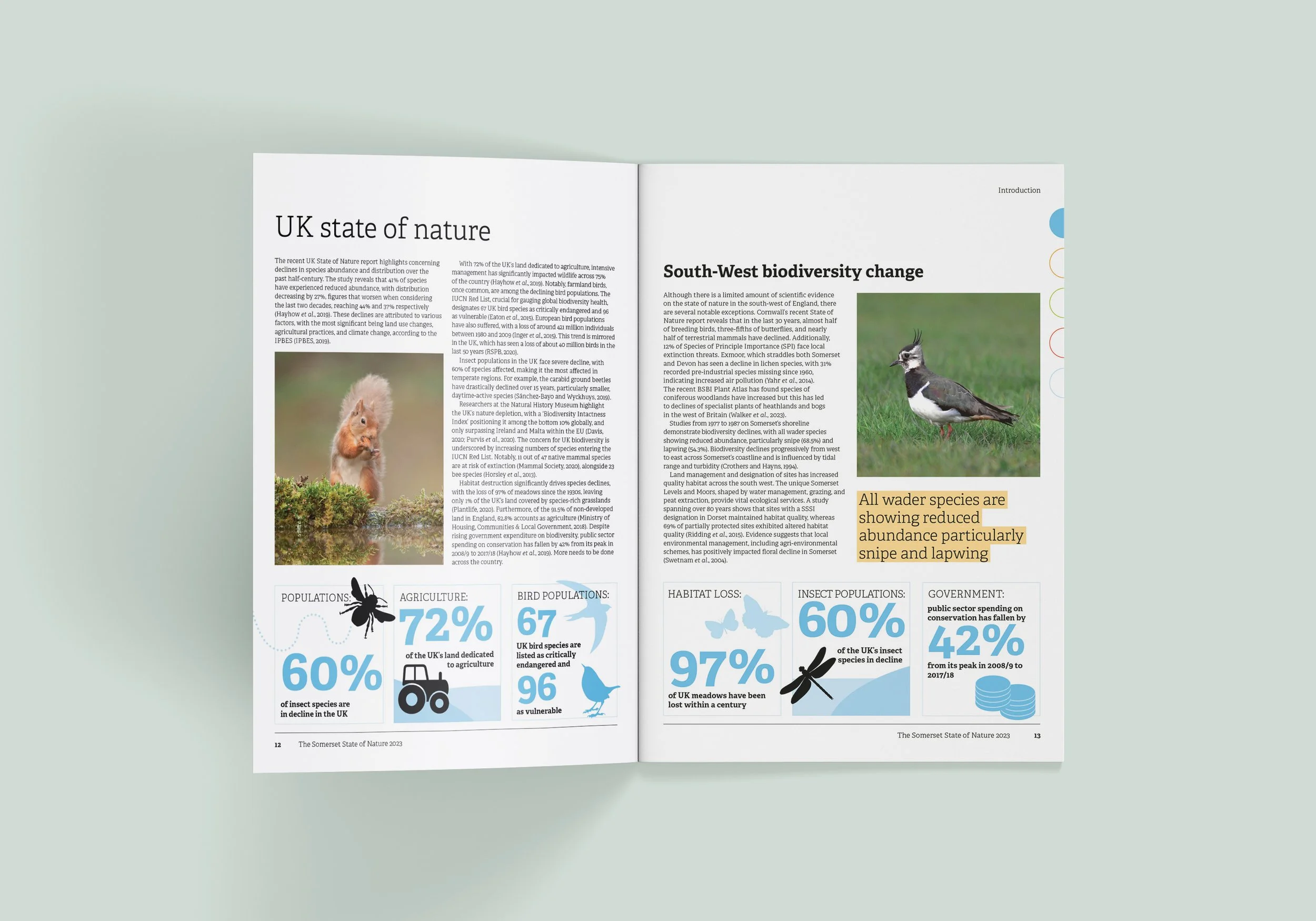 I designed this report, the first of its kind, for Somerset Wildlife Trust. The Somerset State of Nature 2023 report serves as a benchmarking document, and will be updated at regular intervals to assess the changing condition of Somerset’s natural habitats and populations. I designed the initial look and feel, collaborated with the in-house team to create the content structure, and produced the document through to print and digital publication.